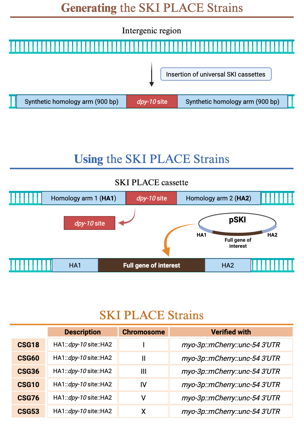 We generated a single-copy knock-in system: one plasmid to target all chromosomes in C. elegans (SKI PLACE). This system uses the pSKI plasmid (with 47 restriction sites), which facilitates the insertion of a gene of interest at specific harbor loci on each chromosome. The pSKI plasmid contains two synthetic 900-bp homology arms that recombine with the SKI PLACE cassettes. This system also uses a single crRNA guide.